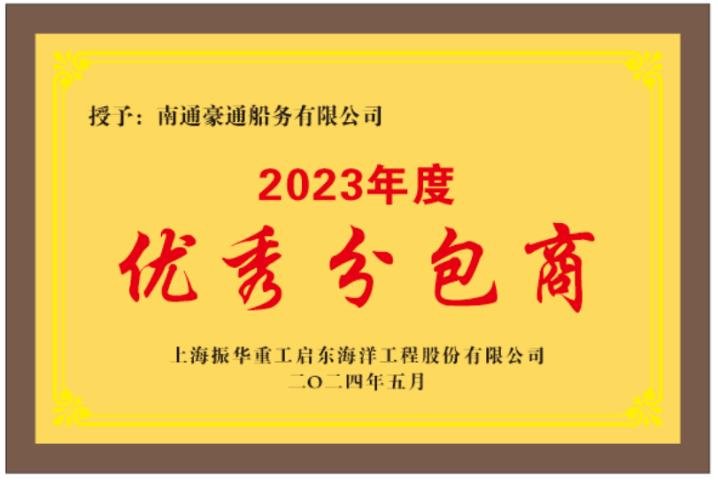 南通豪通船務獲上海振華重工啟東海洋工程股份有限公司2023年度“優(yōu)秀分包商”稱號